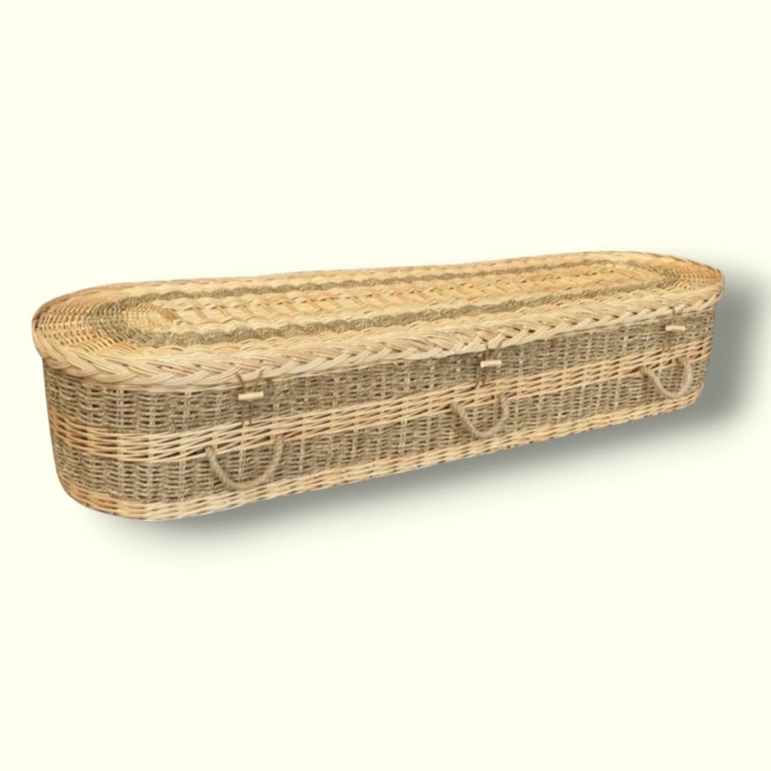 Deze prachtige sierlijke ovale wilgentenen uitvaartmand is geweven met lisdodde. De mand heeft een plat deksel en touwen handgrepen.