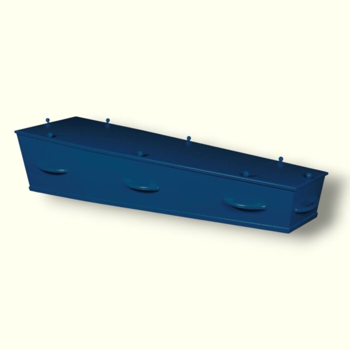 De kist heeft boog-handgrepen en  bol-sluitschroeven in dezelfde blauwe kleur als de uitvaartkist.