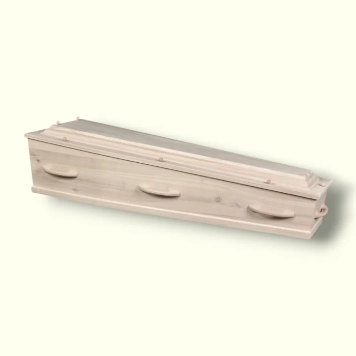 Deze uitvaartkist is gemaakt van massief populierenhout en afgewerkt in een warme, naturel tint. De kist heeft een kroondeksel en stevige houten handgrepen. Binnenin is hij bekleed met zachte katoenen capitonnage en voorzien van een hoofdkussen. Volledig biologisch afbreekbaar – geschikt voor zowel crematie als natuurbegraven.