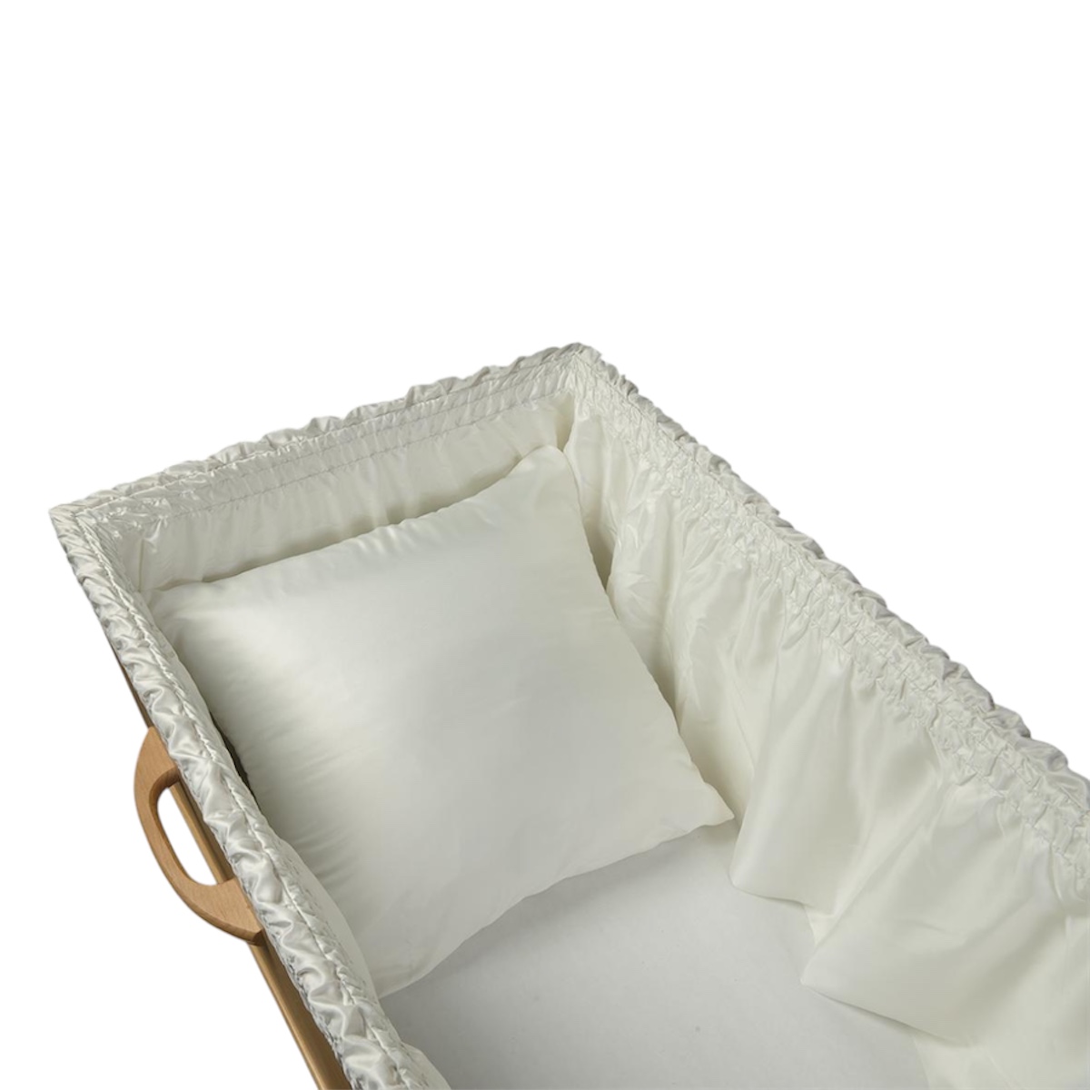 Deze betaalbare uitvaartkist is gemaakt van spaanplaat met een eikenhoutprint en voorzien van een klassiek kapdeksel. De binnenzijde is bekleed met zacht satijn en wordt standaard geleverd met een kussen. Een eenvoudige en nette kist voor wie kiest voor rust, zonder poespas. Geschikt voor zowel crematie als begrafenis.