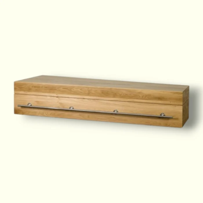 Deze moderne uitvaartkist is gemaakt van massief eikenhout en afgewerkt met doorlopende handgrepen van roestvrij staal. De combinatie van natuurlijke materialen en strakke lijnen geeft de kist een eigentijdse, stijlvolle uitstraling. De binnenzijde is gevoerd met linnen bekleding en wordt standaard geleverd met een hoofdkussen en een deken.