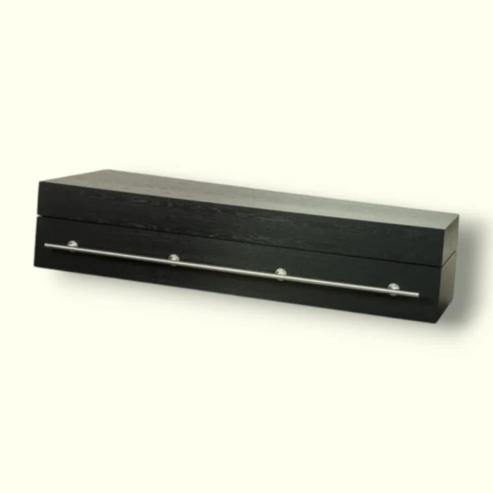 Deze moderne uitvaartkist is afgewerkt met een diepe zwarte eikenfineer laag en voorzien van doorlopende handgrepen in roestvrij staal. De binnenzijde is bekleed met katoen en wordt standaard geleverd met een hoofdkussen. De kist is geschikt voor zowel begrafenis als crematie. Op verzoek is deze kist ook leverbaar in een verlengde of verbrede uitvoering.