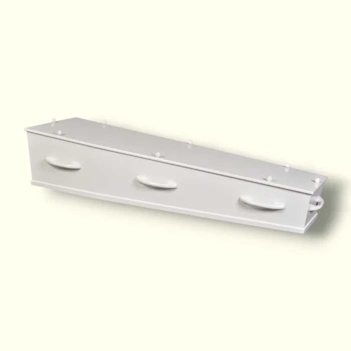Deze MDF-uitvaartkist is afgewerkt met wit gespoten folie en combineert eenvoud met stijl. De binnenzijde is bekleed met gebleekt katoen en voorzien van een zacht kussen, voor een sereen en verfijnd afscheid.